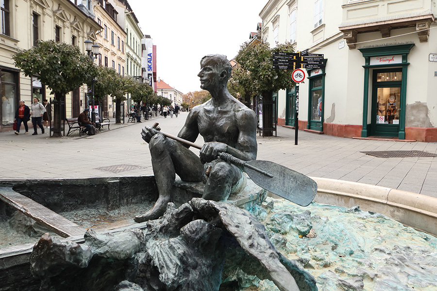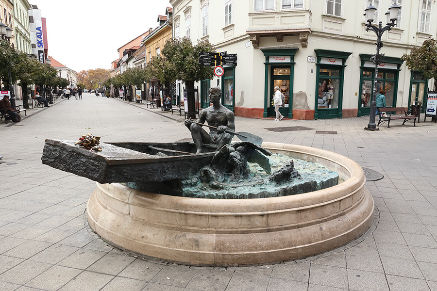 Die Figur zeigt einen jungen Mann in einem Boot, der sich mit einem Ruder abstößt. Sie erinnert an die lange Geschichte Győrs als Stadt der Flüsse, wo Donau, Raab und Rábca zusammentreffen. Oft wird sie fälschlich mit dem Hochwasser von 1954 in Verbindung gebracht, tatsächlich symbolisiert sie aber die enge Beziehung der Stadt zum Wasser und zur Schifffahrt. Heute gilt der „Bootsjunge“ als eines der bekanntesten Wahrzeichen von Győr und ein beliebtes Fotomotiv in der Altstadt.