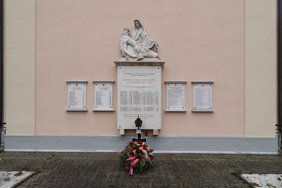 Das Kriegerdenkmal an der Südfassade der Pfarrkirche Hl. Margaretha in Horitschon, ist eine eindrucksvolle Gedenkstätte für die Gefallenen und Opfer der beiden Weltkriege. Im Zentrum befindet sich eine große Gedenktafel mit Inschriften und den Namen der Verstorbenen, flankiert von mehreren kleineren Tafeln, die den Gefallenen des Ersten und Zweiten Weltkriegs sowie zivilen Opfern gewidmet sind. Am unteren Bereich erinnert ein Kranz mit Schleifen an das fortdauernde Gedenken, während eine kleine Laterne symbolisch für das ewige Licht steht.