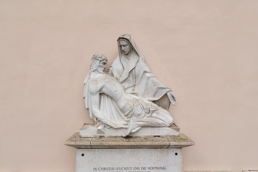 Besonders prägend ist die Skulptur im oberen Teil: eine Pietà. Sie zeigt die Maria, die den leblosen Jesus Christus in ihrem Schoß hält. Diese Darstellung ist von großer emotionaler Tiefe – Maria blickt ruhig und gefasst auf den toten Sohn, während dessen Körper schlaff in ihren Armen liegt. Die Szene steht sinnbildlich für Trauer, Schmerz und zugleich Hoffnung auf Erlösung.