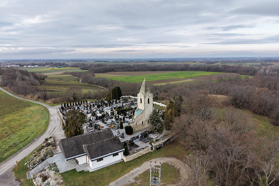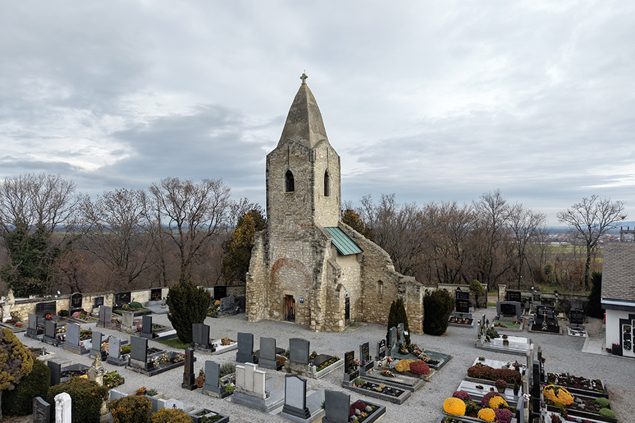 Die Kirchenruine von Leithaprodersdorf gilt als bedeutendstes historisches Wahrzeichen der Gemeinde und prägt das Erscheinungsbild des Ortes seit Jahrhunderten. Die Anlage war ursprünglich eine dreischiffige, mittelalterliche Pfarrkirche, deren Grundriss und Mauerzüge bis heute klar erkennbar sind. Besonders charakteristisch ist die romanische Halbkreisapsis, deren Mauerwerk trotz der Zerstörungen weitgehend erhalten blieb. Die Bauweise zeigt typische Elemente der Romanik, darunter massive Steinquader, schmale Fensteröffnungen und eine klare, funktionale Gliederung des Innenraums.