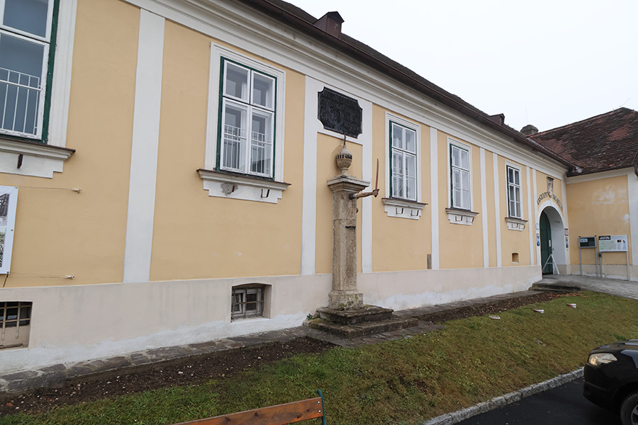 1804 wurde der Pranger vor dem Gebäude aufgestellt; bis zu diesem Zeitpunkt hatte er sich vor dem herrschaftlichen Wirtshaus auf dem Platzl (heute Hauptplatz) befunden. Die Prangersäule stammt aus dem 17. Jahrhundert. Heute steht der Pranger beim Stadt- und Tuchmachermuseum Pinkafeld.